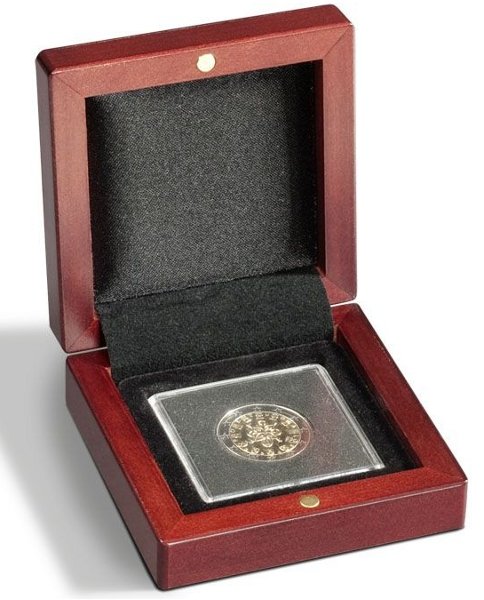 etui służy do estetycznego wyeksponowania monety - np. na prezent,można w nim bezpiecznie przechowywać monetę o średnicy od 14 do 41 mm,do monet należy dokupić specjalne kapsle Quadrum o wymiarach 50x50 mm