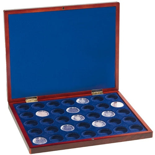 kaseta renomowanej firmy Leuchtturm,przeznaczona do przechowywania i estetycznego wyeksponowania 35 monet obiegowych Nordic Gold o nominale 2 zł w kapslach,ułatwia transport i umożliwia bardzo wygodne przenoszenie Twojej kolekcji,kaseta posiada 35 okrągłych miejsc (5 x 7), na monety o średnicy 27 mm,wymiary kasety: 330 x 270 x 30 mm,wykonana z polerowanego mahoniu,kolor wkładu: welur i satyna w kolorze niebieskim,zamykana na magnes.