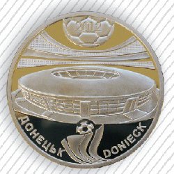 Donieck - srebrna moneta kolekcjonerska wchodząca w skład ciekawej kolekcji "Stadiony ukraińskie" upamiętniającej cztery ukraińskie stadiony, na których rozgrywane będą mecze mistrzostw w piłce nożnej starego kontynentu.